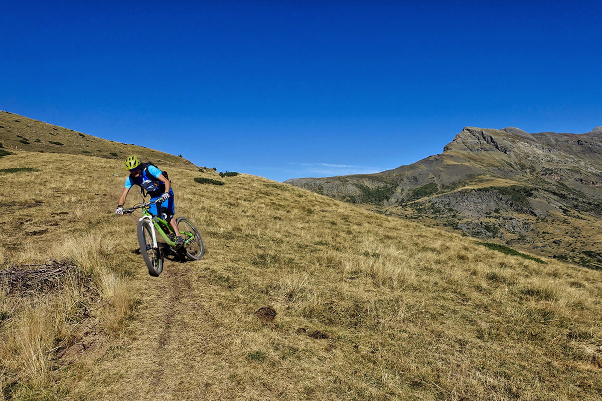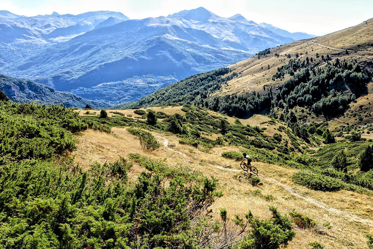 Embark on the Enduro Flow Pyrenees MTB tour: a twin-based, high-altitude journey through the stunning Pyrenees. Experience exhilarating rides, reaching nearly 3.000m and featuring single descents of almost 2.000m from high alpine to your hotel.